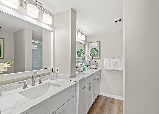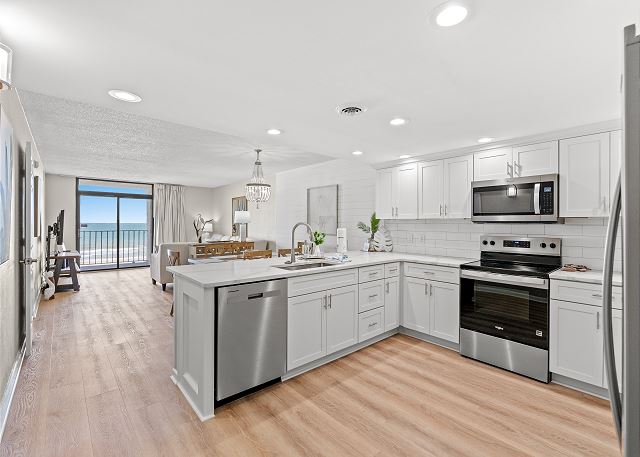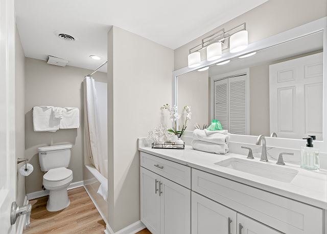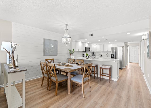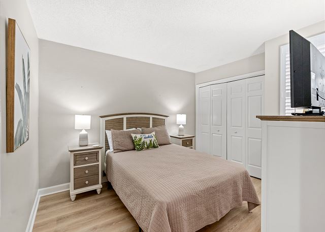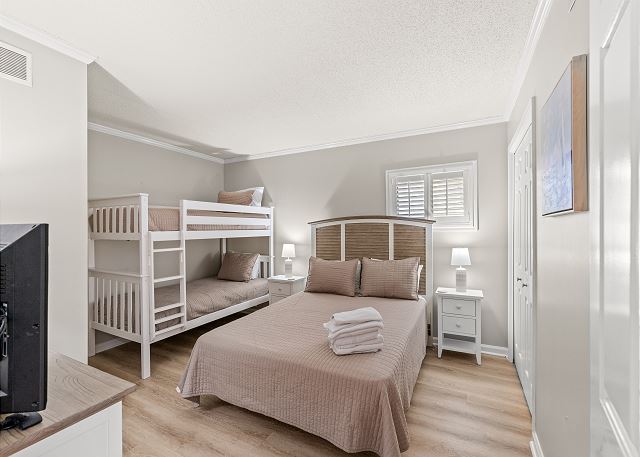 This recently renovated 3 Bedroom/2 Bath unit is set up to accommodate a family 8 with 1 King in the master bedroom, 1 Queen & Twin bunkbeds in bedroom 2, and 1 Queen in bedroom 3.