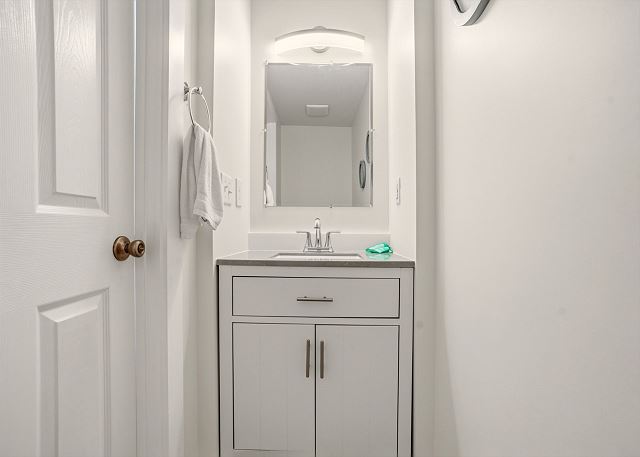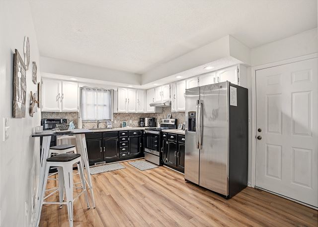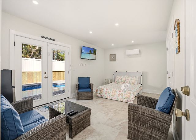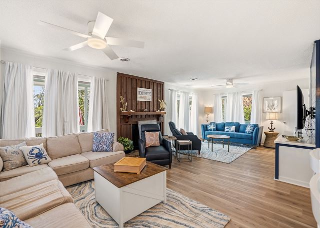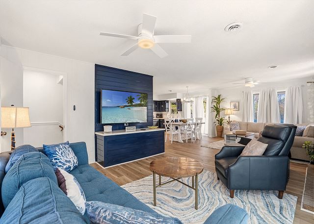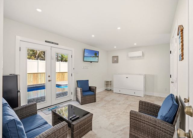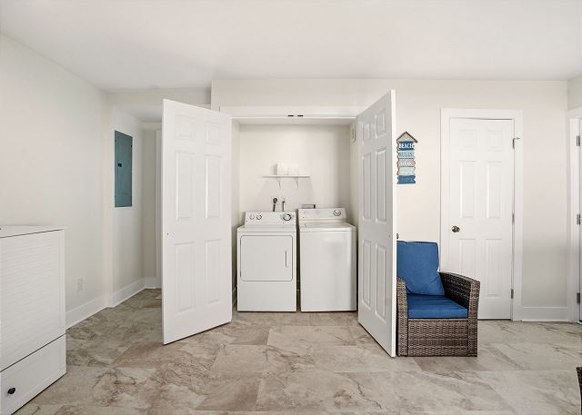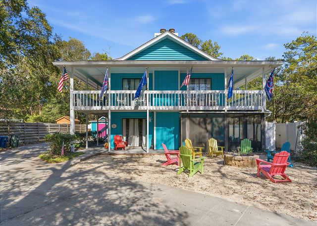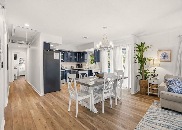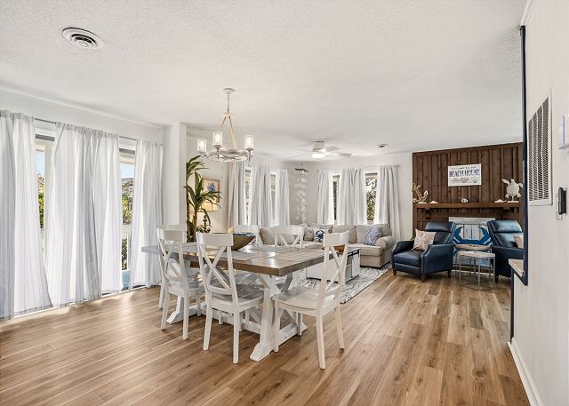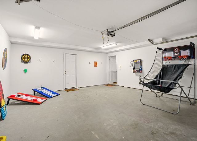 Enjoy all the comforts of home while you are at the beach in this wonderfully decorated beach house that offers 2 living rooms, 2 dining areas, 2 kitchens, 7 TV'S, a game room and bonus room off the pool. The ground level resembles a mother-in-law suite with 1 bedroom w/1 king bed, a full bathroom, full kitchen, dining area, living room and a screened in patio. From the kitchen, you have access to the 2 car garage which doubles as a game room with a basketball game, corn hole, and an arcade game. Off the garage is the bonus room which features indoor/outdoor furniture, a mini fridge, 1/2 bath, queen sized murphy bed and full sized washer & dryer. The 2nd floor offers the remaining 2 bedrooms, 2 bathrooms, full kitchen, dining area, living room with sleeper sofa & covered balcony with outdoor seating.