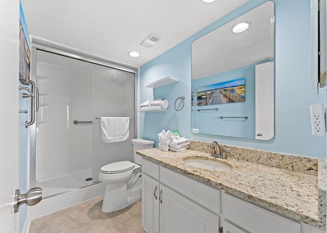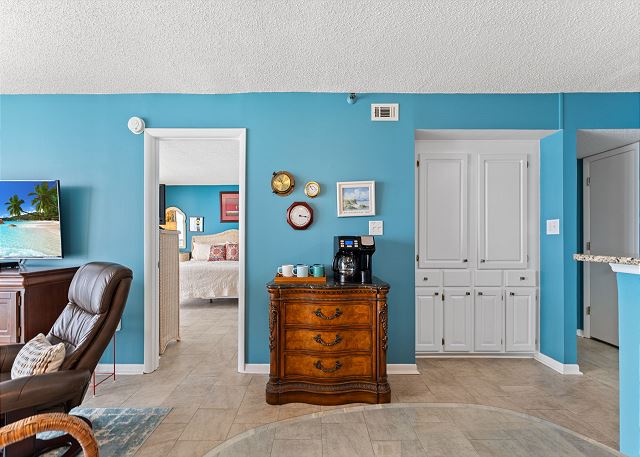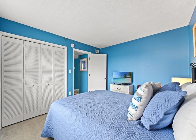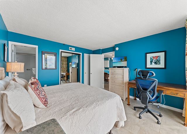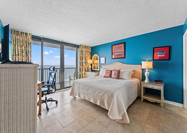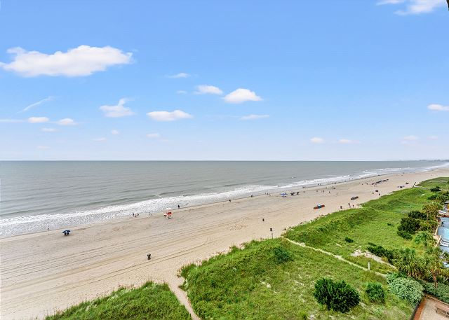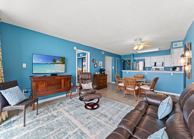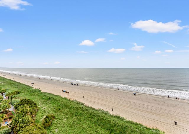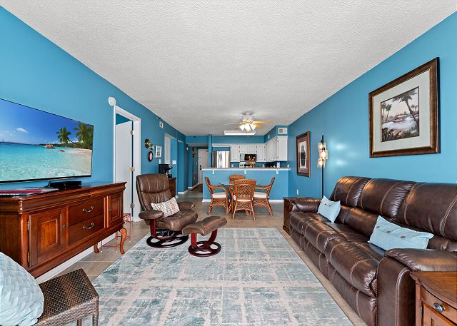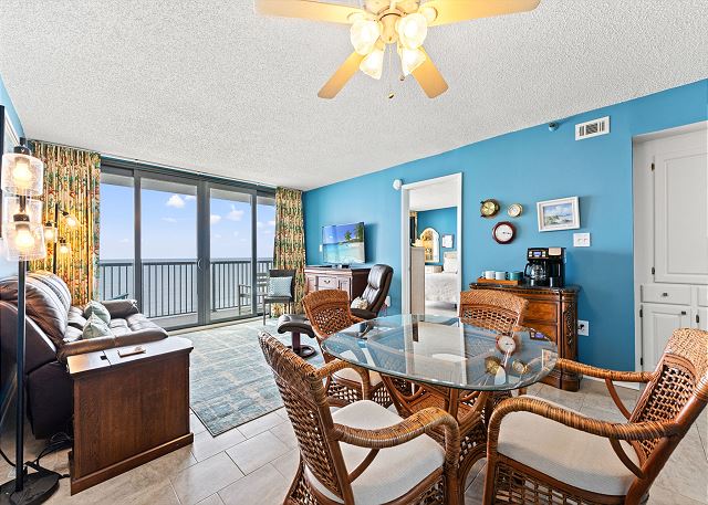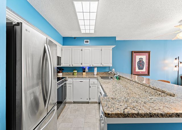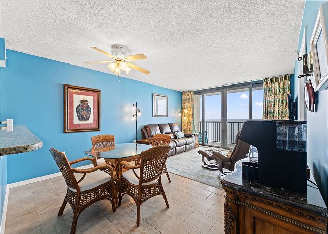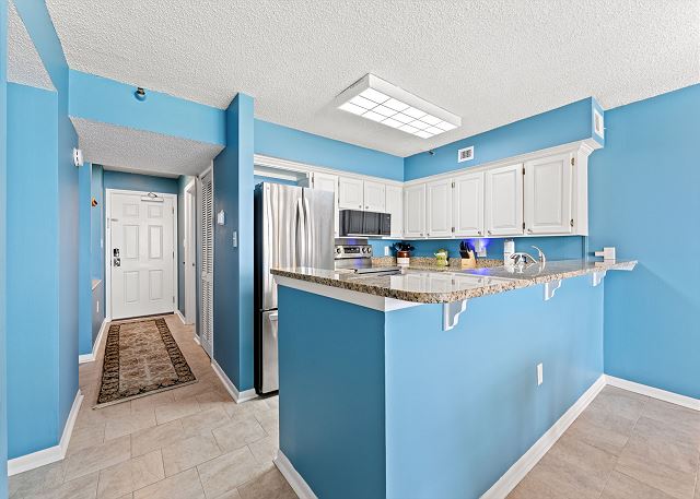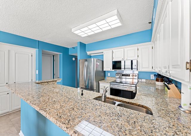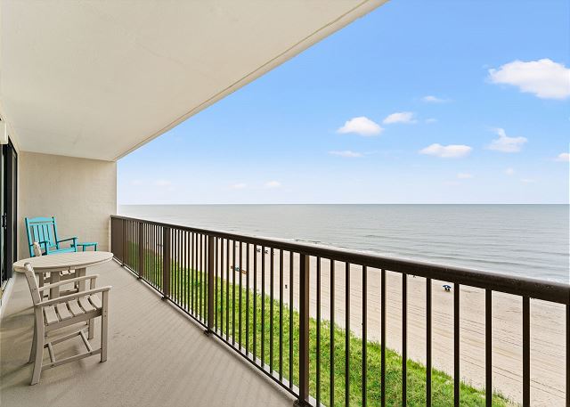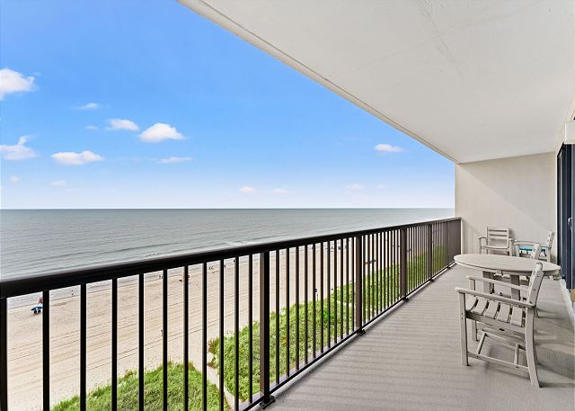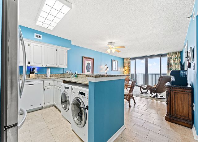 Relax on the private 150 sq ft oceanfront balcony featuring comfortable rocking chairs and a polywood dining set. The private balcony can be accessed from the living room and master bedroom, which combined, offer 25 ft of floor to ceiling windows w/double sliding glass door. This top floor, penthouse condo, features a fully equipped kitchen complete with everything needed to prepare meals and stainless steel appliances. In addition, there are flat screen TV's in the living room and 2 bedrooms w/cable (twin room does not have a TV), a workspace, free high speed internet Wi-Fi, a full size washer & dryer in unit, and tile flooring throughout.